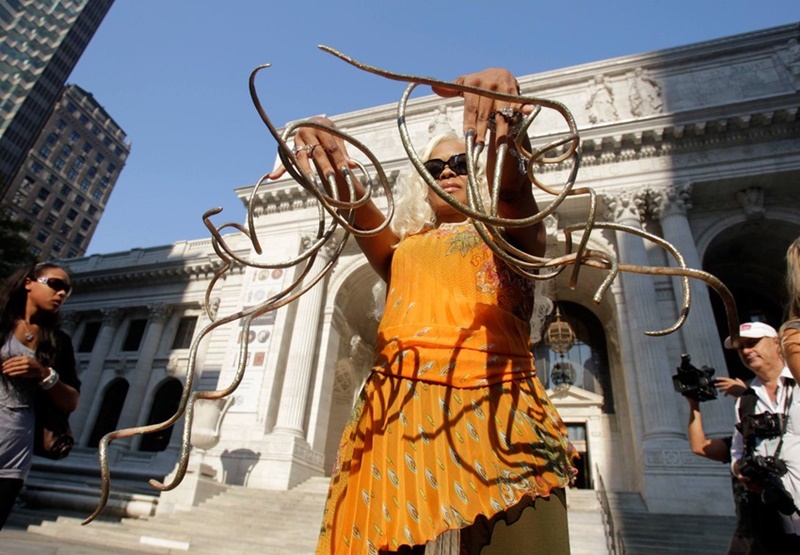 Christine Walton, de Las Vegas, está mantendo seu título de dona das maiores unhas do mundo desde 2011 – vamos combinar que deve ser difícil bater esse recorde. A moça tem mais de 7 metros de unhas das mãos!